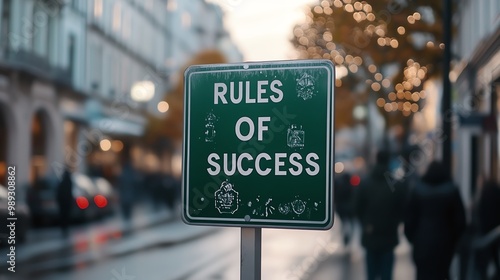 Street sign with 'Rules of Success' text, blurred city background, represents motivation, inspiration, and urban life.