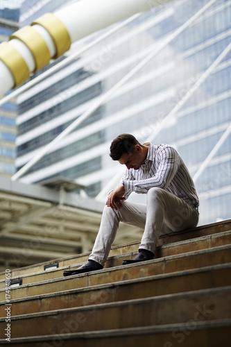 Stress and crying business man alone outdoor. Young business man crying abandoned lost in depression sitting on ground street concrete stairs suffering emotional pain, sadness, looking sick in grunge