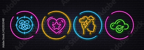 Stress, Ranking star and Mindfulness stress minimal line icons. Neon laser 3d lights. Cloud computing icons. For web, application, printing. Anxiety chat, Love rank, Cloud storm. Vector
