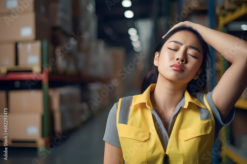 Stressed tired female staff worker sweating from hot weather in summer, working in a warehouse