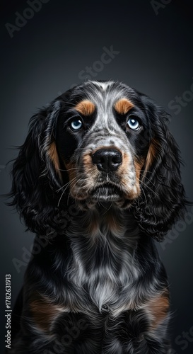 Striking Dog Portrait with Intense Blue Eyes on Dark Background