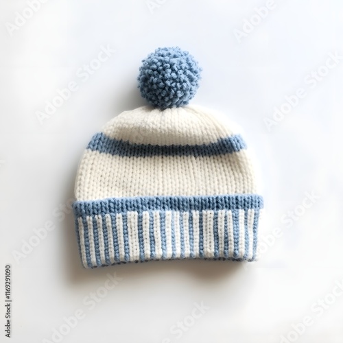 Striped Soft Blue Baby Beanie Hat on Empty White Background