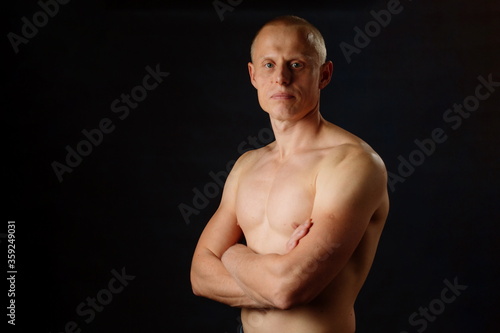 Strong Young Bearded 30s Posing On Dark Background Studio Portrait. Sport Fitness Healthy Lifestyle Concept. Copy Space.