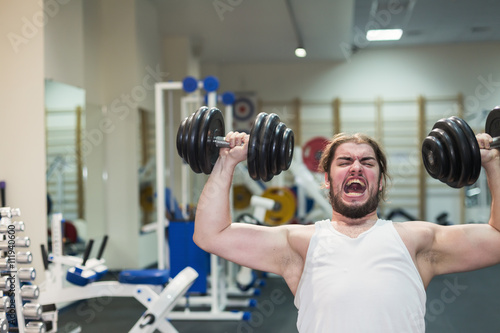 Strong young man bodybuilder exercising with dumbbells in a gym