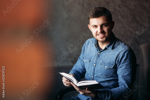 Student read book in cafe. Study and education