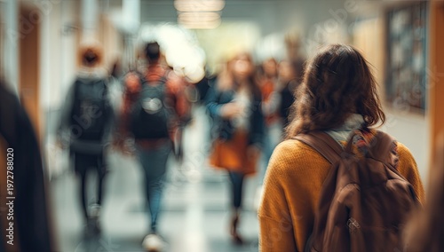 Student walking down school hallway with other students blurred in background.