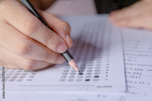 Students hand holding pencil writing selected choice on answer sheets and Mathematics question sheets. students testing doing examination. school exam.