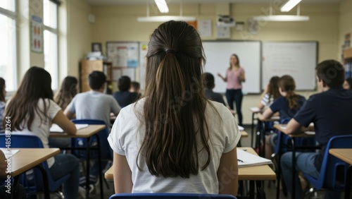 Students listening to teacher in classroom lecture