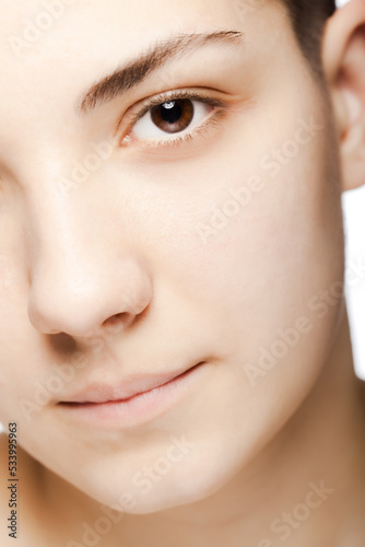 studio portrait of a beautiful young woman with very short hair against white backgroung.