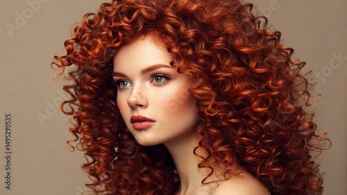 Studio shot focusing on a person's head and shoulders, showcasing a striking red curly hairstyle with lots of volume