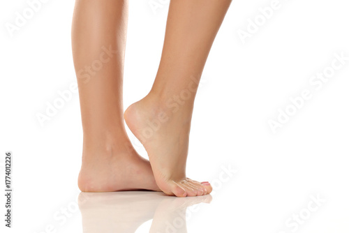 Studio shot, side view of a woman’s feet and legs on tiptoes with smooth skin on a white background.
