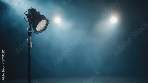 Studio spotlight, smoky backdrop, stage lighting, film production
