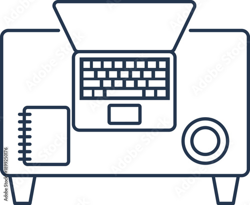 Study desk with open laptop and notebook line art vector, symbolizing online learning setup, remote study desk, e-learning and digital education workspace visuals