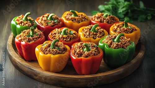 Stuffed bell peppers with rice and herbs on a wooden tray.