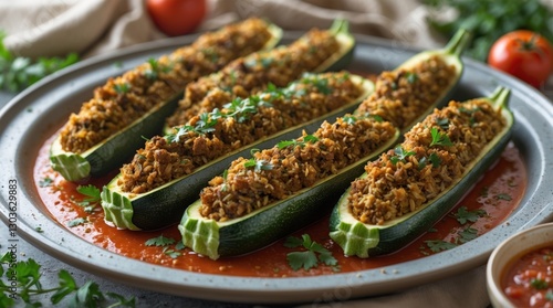 Stuffed Zucchini Boats with Rice and Herbs in a Ceramic Dish, Perfect for Mediterranean Cuisine