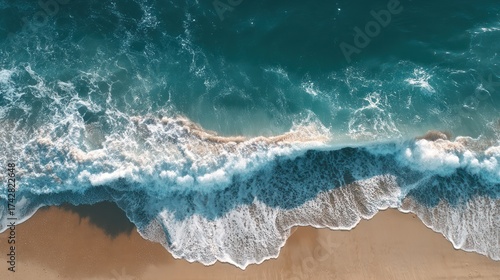 Stunning aerial view of vibrant turquoise ocean waves with white foam crashing onto a beautiful golden sandy beach shore, coastal seascape.