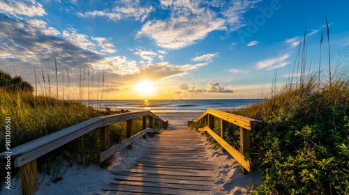 Stunning Beach Walkway at Sunset with Wooden Path Leading to Ocean Waves and Scenic Horizon