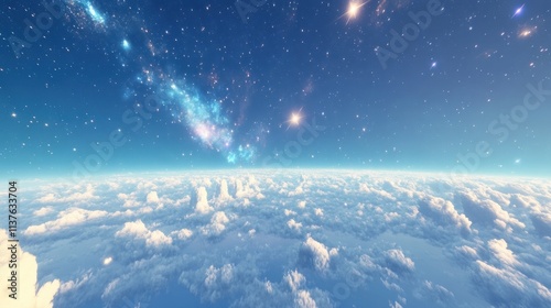 Stunning celestial view above cloudscape, vibrant stars and nebula.