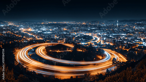 stunning cityscape at night showcasing light trails from vehicles on winding roads, illuminating urban landscape with vibrant colors and sense of motion