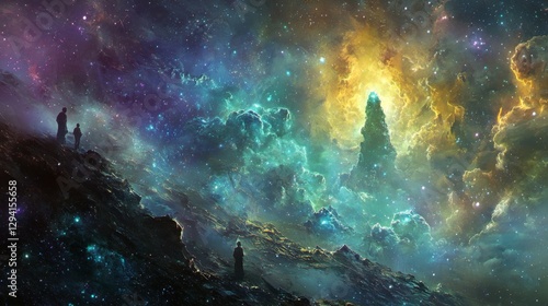 Stunning Cosmic Landscape with Colorful Nebulae and Silhouetted Figures Evoking Wonder and Discovery in Outer Space