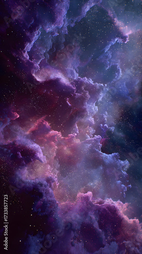 Stunning cosmic nebula with vibrant purple and pink clouds swirling amidst countless sparkling stars, evoking wonder and exploration of the vast universe.