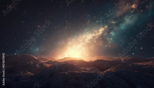 Stunning cosmic scene with glowing nebula and starry sky above serene mountain landscape, capturing celestial beauty and extraterrestrial ambiance.