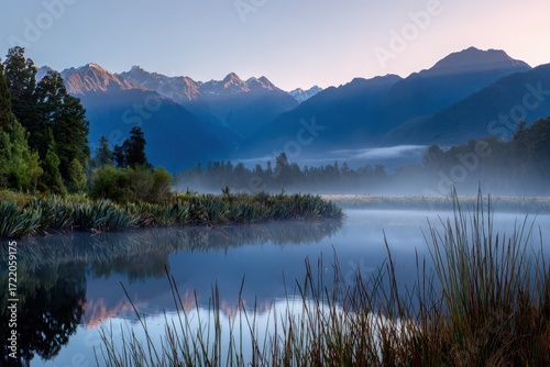 Stunning dawn light over tranquil Fox Glacier Lake in Westland District, New Zealand, showcasing reflections and misty surroundings