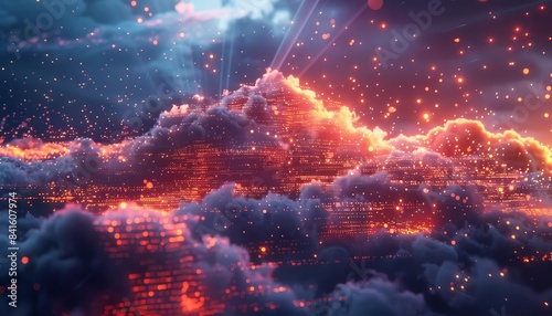 Stunning digital art of a futuristic cloudscape with orange and blue lights, representing a beautiful cyberpunk scenery.