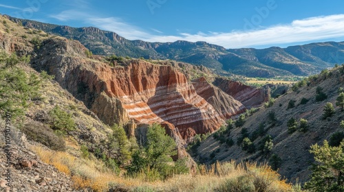 Stunning Landscape of Colorful Rock Formations with Striped Layers and Lush Greenery Surrounded by Majestic Mountains under a Clear Blue Sky