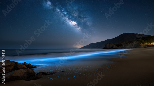 Stunning night sky with Milky Way and stars over tranquil beach landscape showcasing natural beauty and scenic outdoor horizon in a peaceful coastal setting