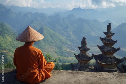 Stunning panoramic view from Fansipan Mountain, featuring a serene Buddhistic temple in Sa Pa