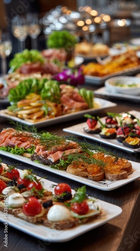 Stunning photo of catering company, office corporate canteen, assortment of dishes and snacks, buffet for a business party, serving dishes at the event.