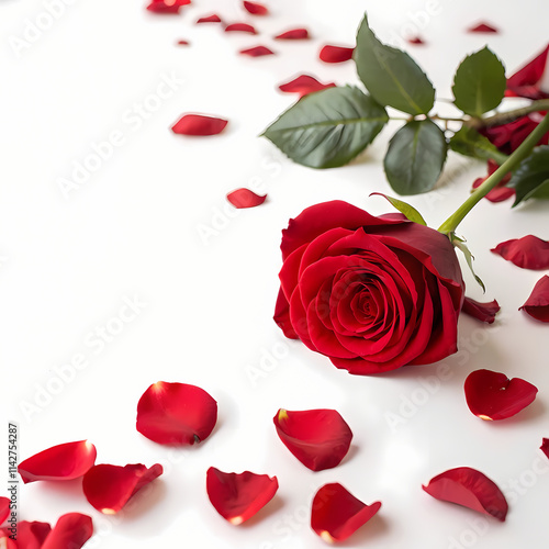 Stunning Red Rose with Scattered Petals on White Background