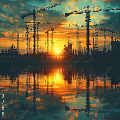 Stunning Showcasing Industrial Cranes Framed Against a Sunset Reflection Over Construction Photo