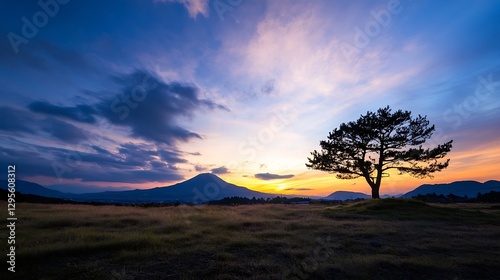 Stunning Sunset Over Mountain Landscape Featuring a Lone Tree for Scenic Beauty : Generative AI