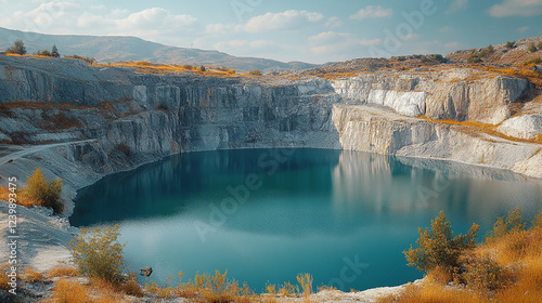 Stunning Turquoise Lake in a Dramatic Quarry Landscape Photo sky blue view calm water rocks stone