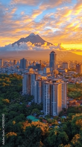 Stunning Urban Skyline Against Lush Greenery and Volcanic Backdrop with Golden Sunset in Yogyakarta Captured at Sunrise - High-rise Buildings Majestic Atmosphere