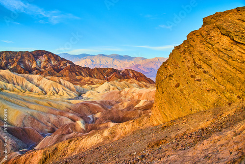 Stunning view by red rocks of Death Valley colorful layers in mountains