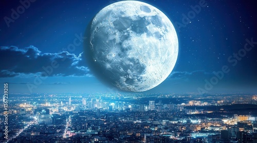 Stunning View of a Large Moon Over a Vibrant City Nightscape with Stars and Clouds