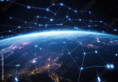 Stunning View of Earth from Space with Bright City Lights and Starry Sky, Featuring a Network of Digital Lines Representing Connectivity and Technology