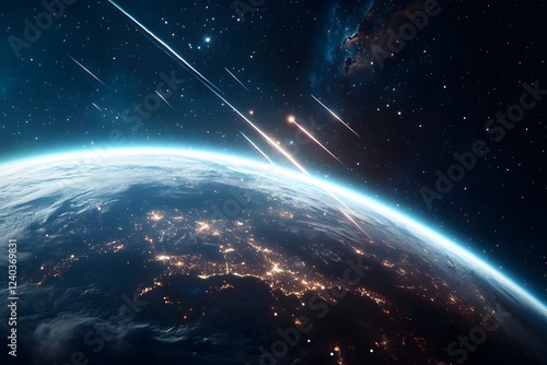 Stunning View of Earth with Bright Meteor Shower Above Nightlights
