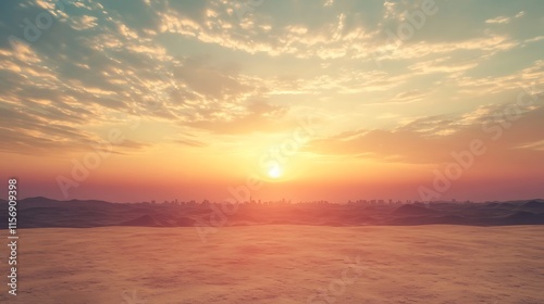 Stunning Wide Shot Photo: Vibrant Sunset Gently Illuminates Serene Desert Landscape. AI Generated