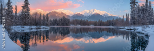 Stunning Winter Sunrise Over Snow Capped Mountains and Serene Lake
