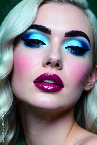 Stunning woman with vibrant blue eyeshadow and glossy magenta lips, exuding modern glamour and confidence for fashion and beauty projects.