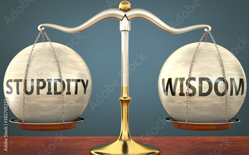 stupidity and wisdom staying in balance - pictured as a metal scale with weights and labels stupidity and wisdom to symbolize balance and symmetry of those concepts, 3d illustration