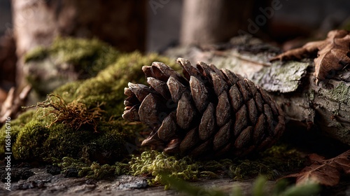 Style a creative still life inspired by forest floor textures: bark, moss, leaves, and pinecones layered organically