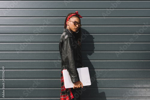 stylish african american girl with laptop