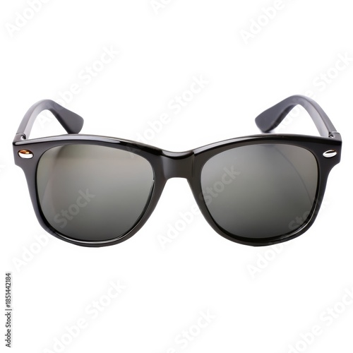 Stylish black sunglasses with dark lenses and a classic frame on white background