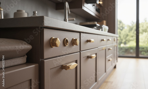Stylish cabinet handles in trendy mocha mousse and gold accents, with geometric shapes, mounted on textured matte kitchen cabinets in
