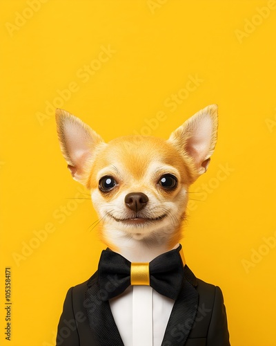 Stylish Chihuahua in a Tuxedo Against a Bright Yellow Background